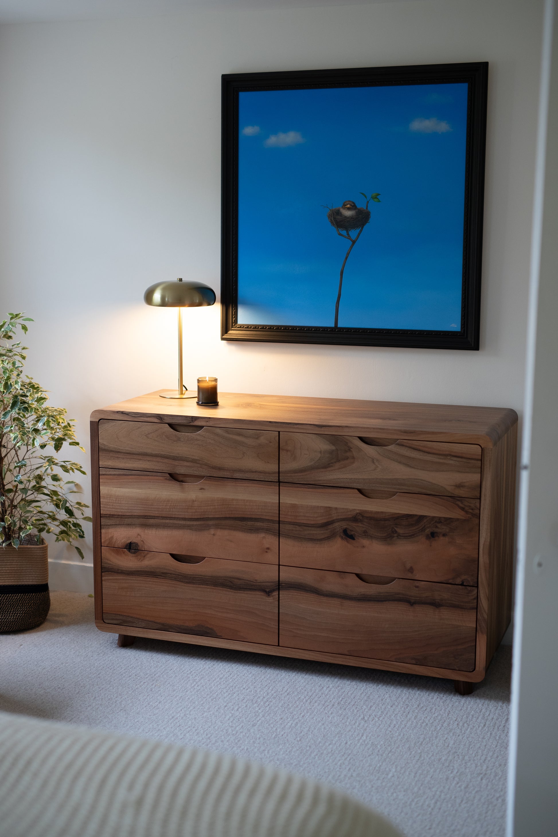 The Ami Walnut Chest of Drawers is a handcrafted, elegant piece of solid walnut. It offers a timeless design with ample storage space. The sideboard showcases the natural beauty of the wood's grain and is built to last with premium craftsmanship. Customisable in size, it's ideal for living or dining spaces, adding functionality and aesthetic appeal.