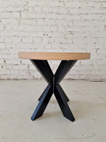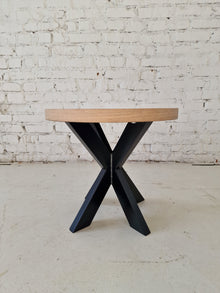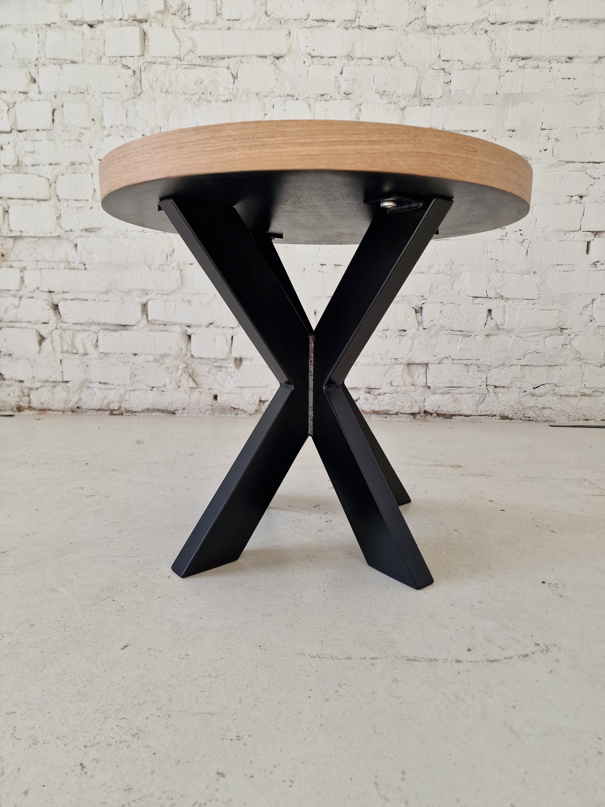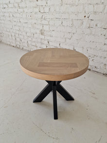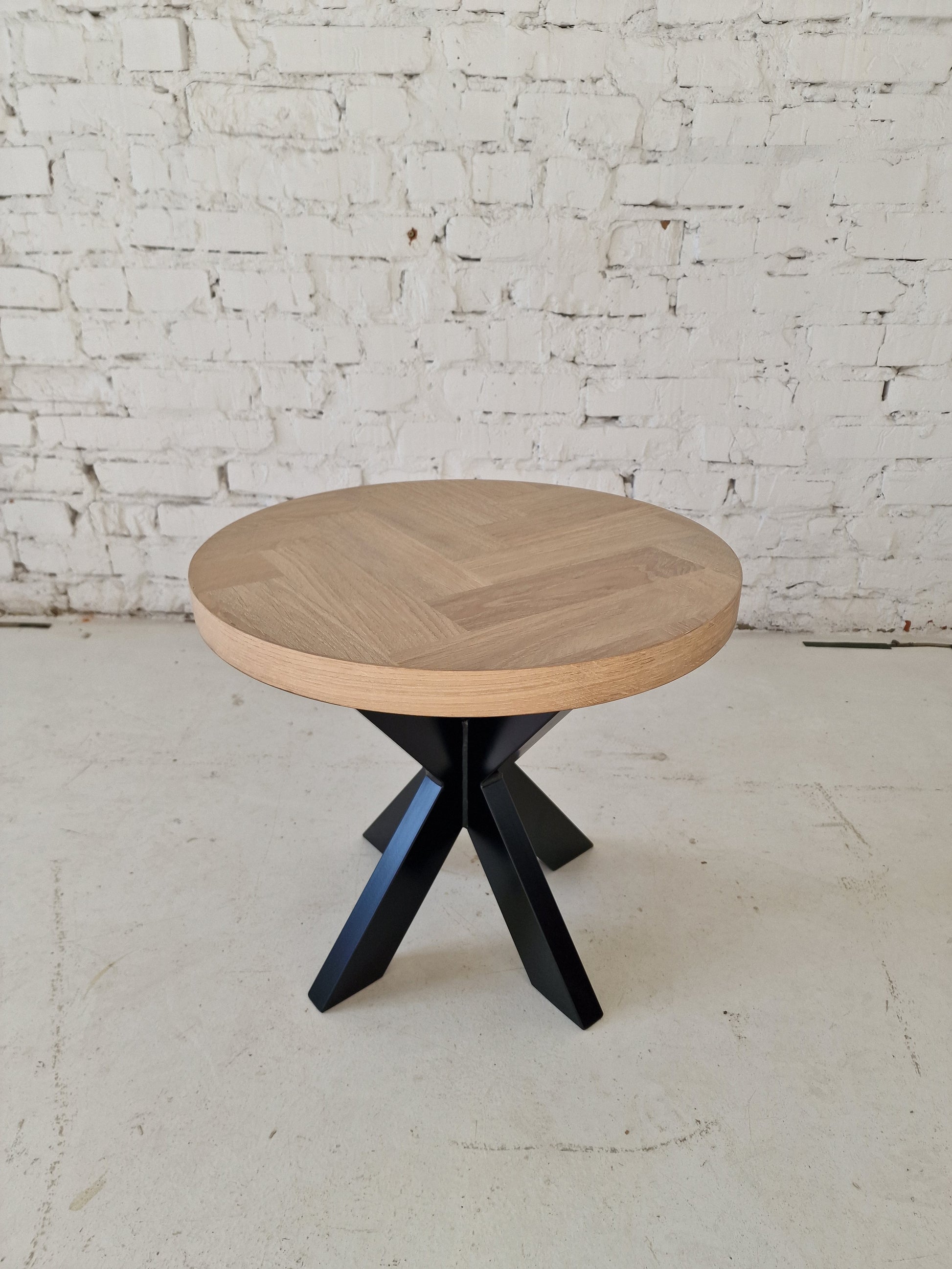Astrid Round Herringbone Coffee Table (50cm) – Crafted in Cotton Oak with 15mm solid oak staves on 25mm birch plywood, FSC-certified and oven-dried for durability. Finished with Rubio Monocoat oil for lasting wear resistance. Standard 45cm height with detachable metal legs for easy transport.