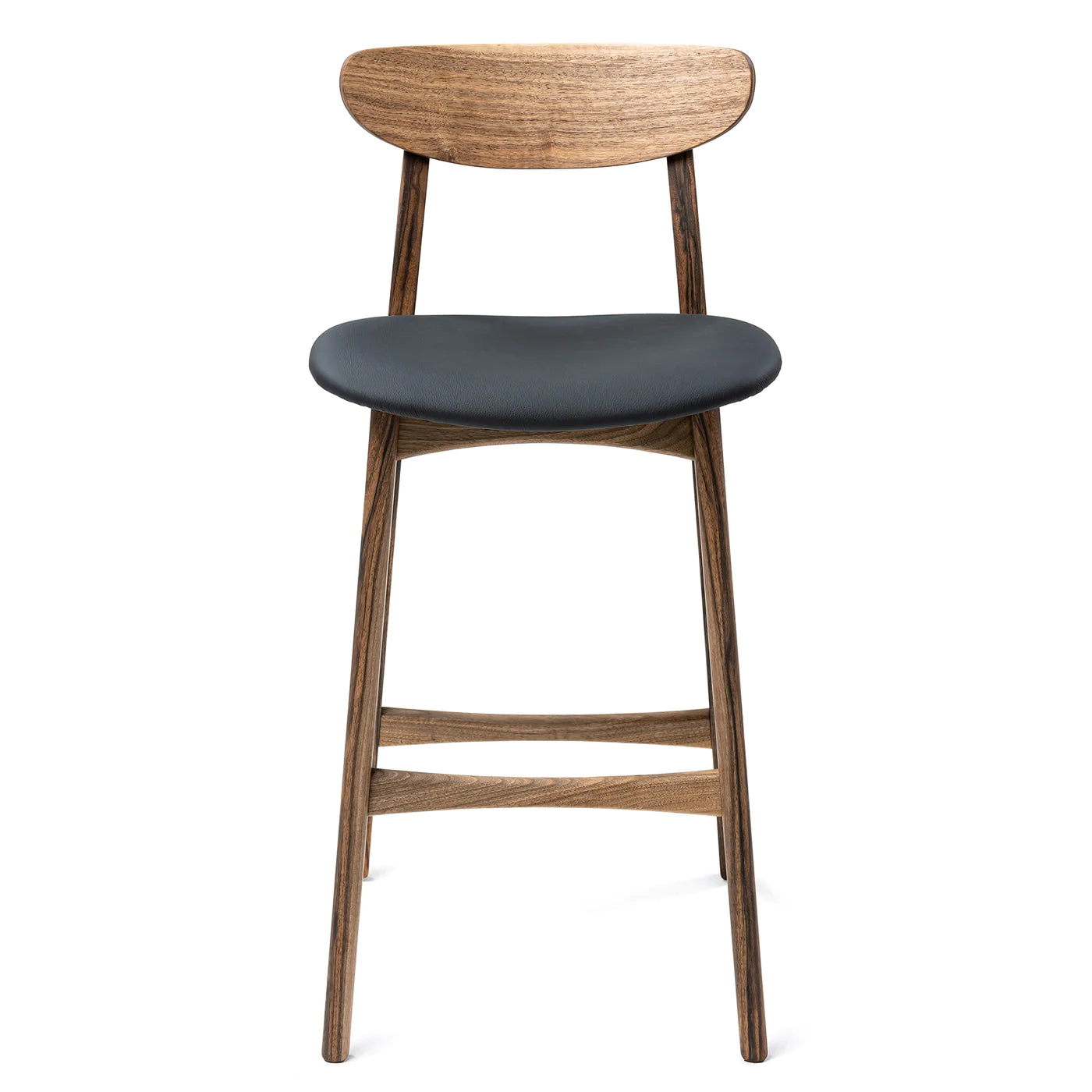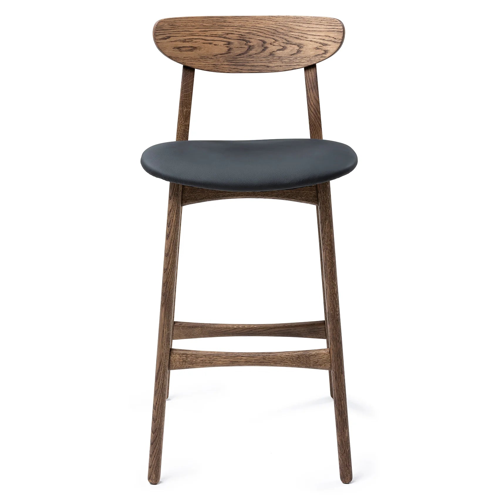 The bistro bar stool is available in solid oak or walnut, with a customisable colour finish of the wood and seat finish in fabric or leather to suit your style and comfort preferences. For inquiries, please contact us at b2b@s10home.com.