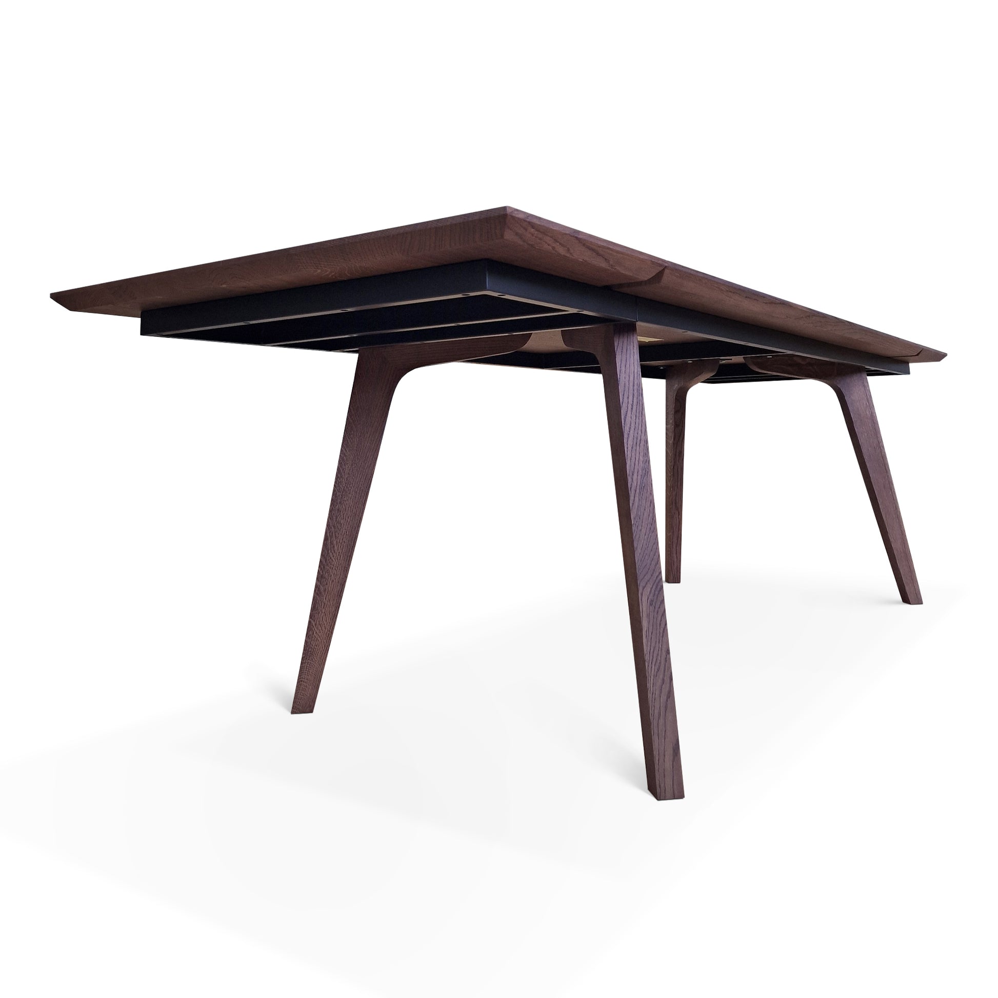 Handcrafted extendable dark oak table 180×90 cm from the Aurora Collection. Made from solid oak planks (30 mm thick) with a rich chocolate oil finish, this elegant 6–8 seater table features a sturdy metal base for exceptional strength and durability. The wood is FSC Recycled 100% certified and free from chemicals.