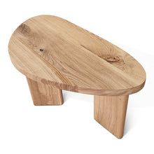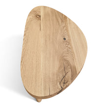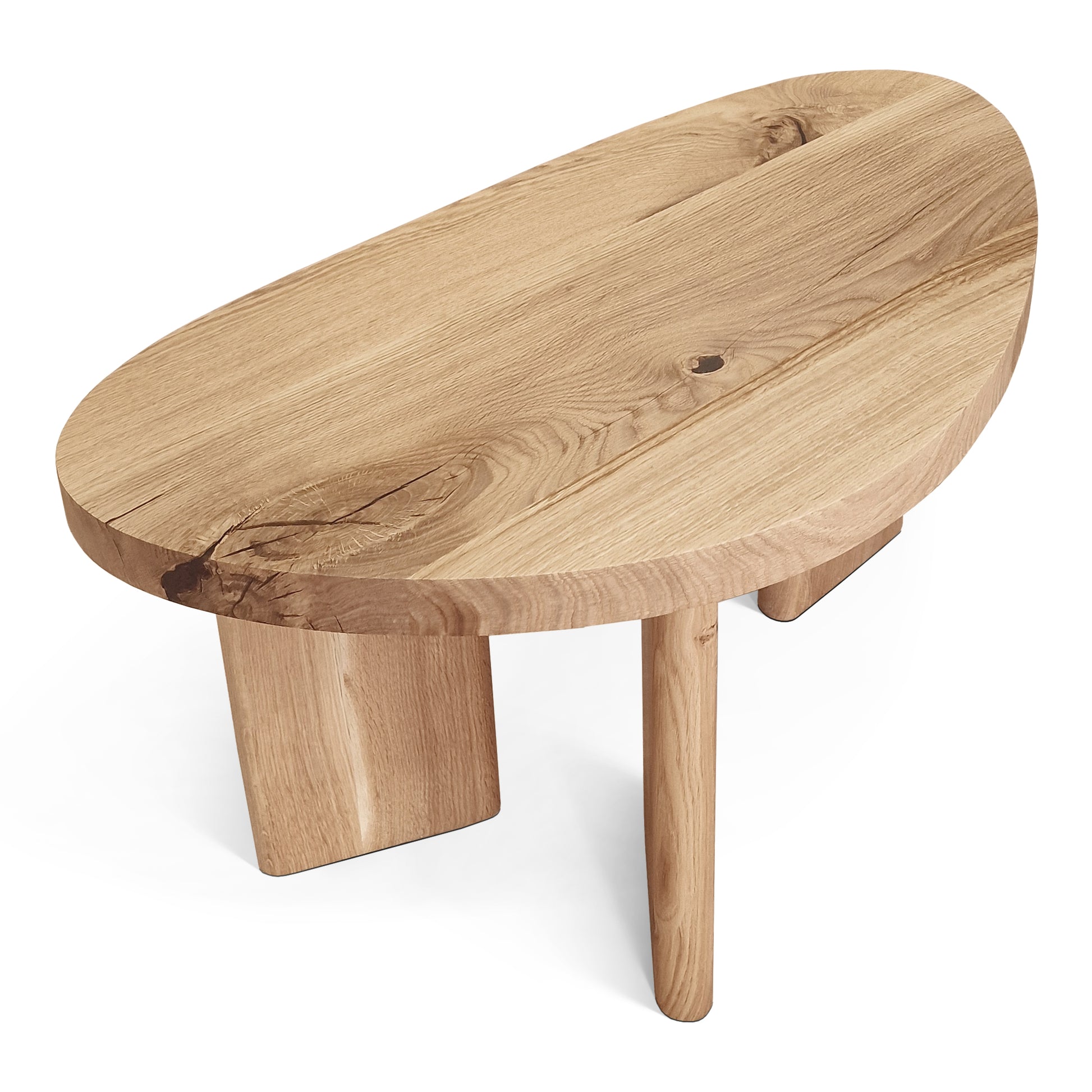 The Liv Coffee Table showcases a beautifully organic shape crafted from solid oak, highlighting its naturally smooth surface and distinctive grain patterns. Supported by three robust wooden legs, it achieves stability with a subtle elegance. The coffee table is 45 cm height (but can be customised to any other height), with a tabletop thickness of approximately 2 cm, ideal for creating a warm and inviting atmosphere.