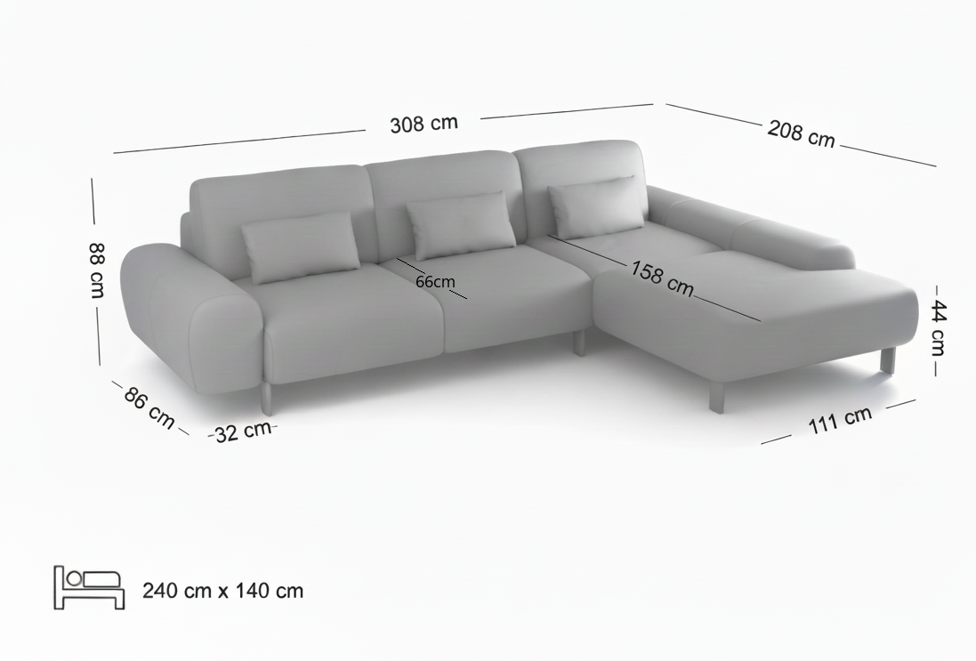 Discover the Milo Sofa Bed, a statement piece that brings expansive luxury and contemporary elegance to your living space. Designed for those who prioritize both style and roominess, this premium three-seater corner sofa measures a generous 308×208 cm, offering an impressive area for relaxation and social gatherings. It effortlessly transforms into an oversized 240×140 cm sleeping area, providing an exceptional level of comfort for you or your overnight guests.